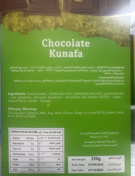 Chocolate KUNAFA PISTACHIO Ingrédients : Beurre de cacao – Lait entier – Lait de vache écrémé – Poudre de cacao – Pistaches – Amandes – Émulsifiant de soja Nicitin ...