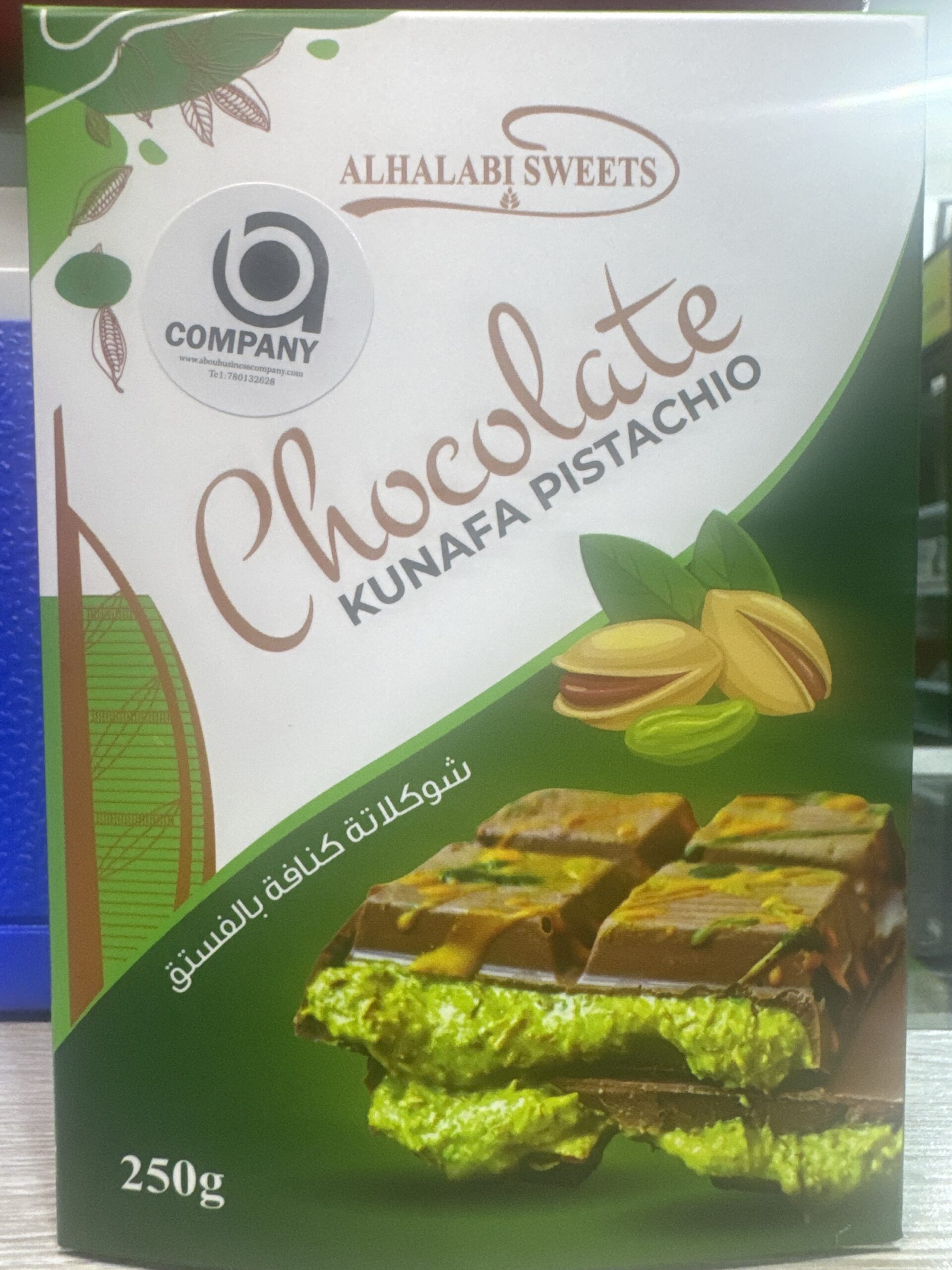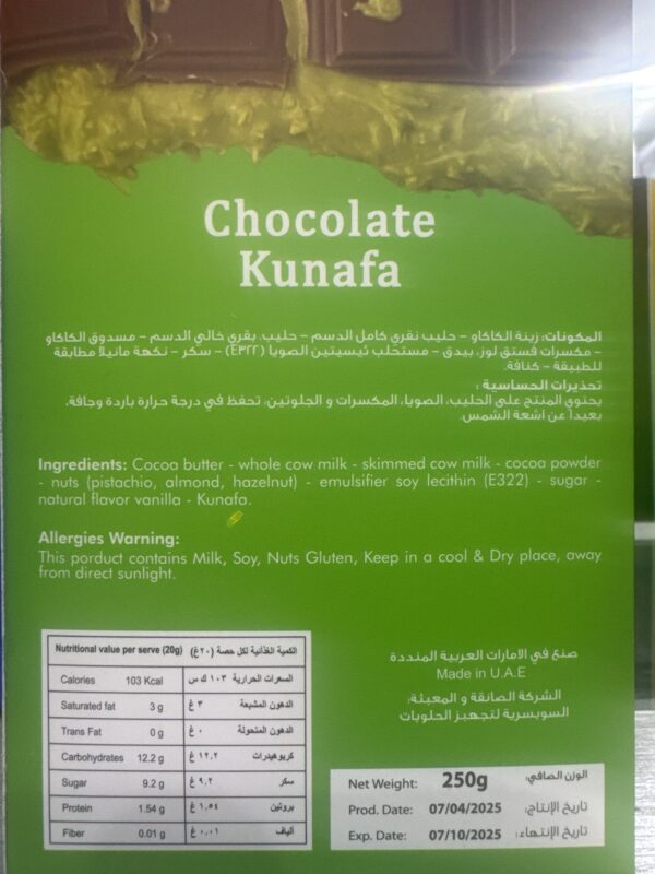 Ingrédients : Beurre de cacao – Lait entier – Lait de vache écrémé – Poudre de cacao – Pistaches – Amandes – Émulsifiant de soja Nicitin (4322) – Sucre – Arôme naturel identique de Manille – Kunafa
